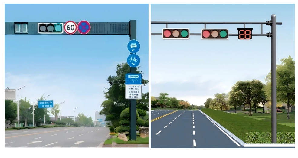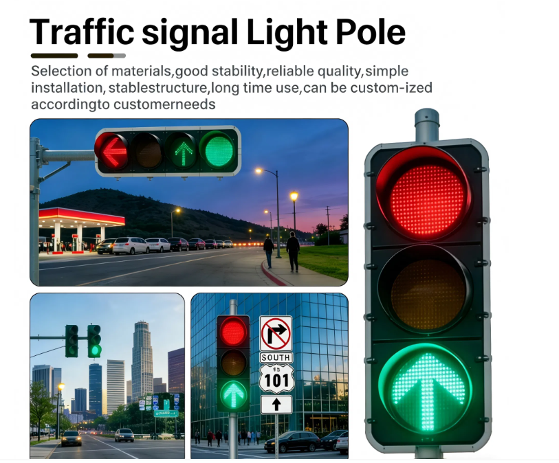 Traffic signal light poles for roads, typically made of Q235 hot-dip galvanized steel. Customization services available for styles, materials, diameters, thicknesses, and height.